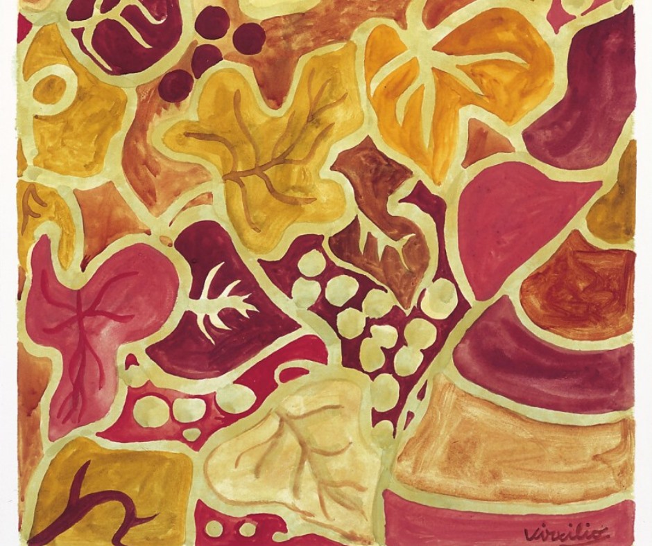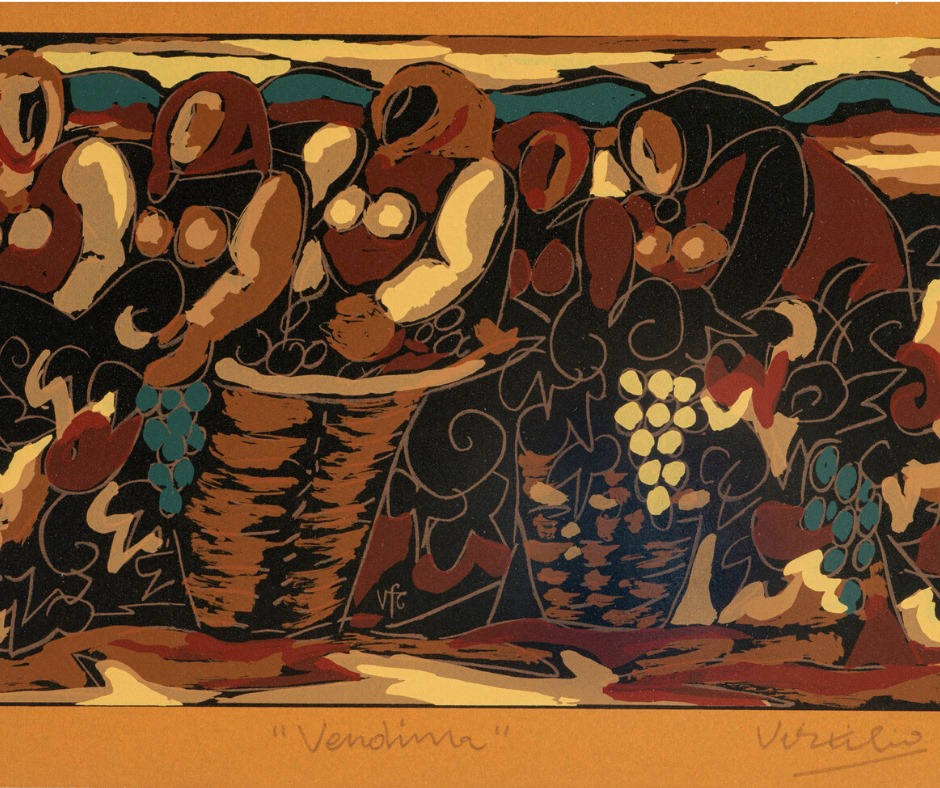 Dentro de sus pinturas, caracterizadas por una importante fuerza cromática y con vivos colores, Virxilio también le dedica un pequeño espacio a la temática vitícola, siendo muy habitual encontrar composiciones como las que os ofrecemos, en las que predominan racimos de uvas y hojas de parra, al mismo tiempo que inmortaliza bajo su pincelada escenas durante la vendimia, en las que destacan las vendimadoras y resalta el papel de la mujer trabajadora del rural.