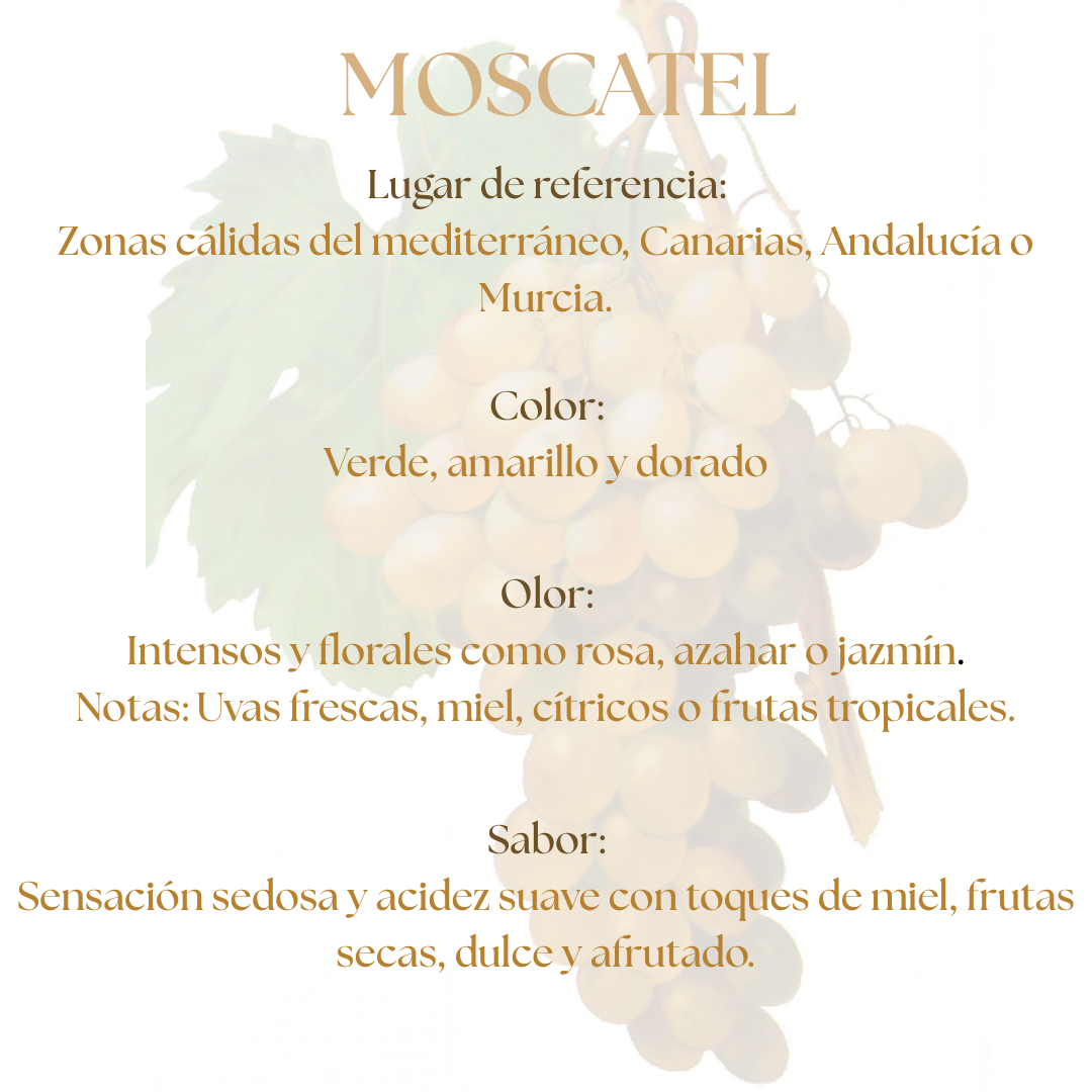 El vino moscatel es un tipo de vino dulce que procede de variedades de uva del mismo nombre, una de las más antiguas y populares del mundo. El moscatel es una uva aromática dulce de sabores florales, de piel gruesa y gran cantidad de azúcar.