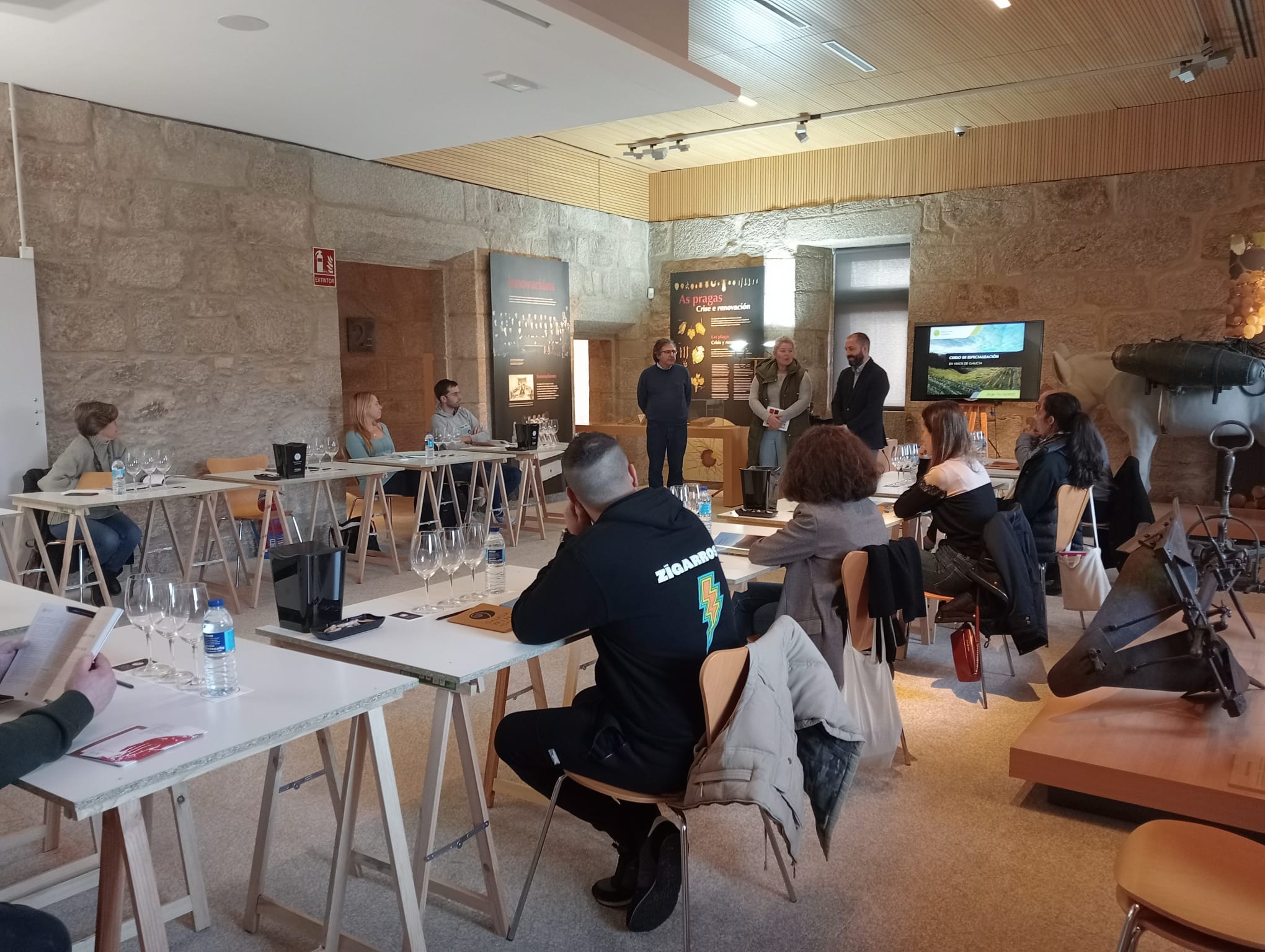 Este fin de semana levouse a cabo no Museo do Viño de Galicia o “Curso de Especialización en Viños” impartido por Jorge Vila, fundador do Instituto Galego do Viño e da Galicia Wine Academy. O curso impartiuse o venres 26 de xaneiro pola tarde e o sábado 27 de xaneiro pola mañá, cun duración de 9 horas nas que se fixo un percorrido polas variedades de uva, os climas e os solos da nosa rexión. O curso contou con dúas partes: na primeira fixose a introdución e falouse da historia do viño e das D.O. Rías Baixas e Ribeiro e na segunda parte falouse das Denominacións de orixe Ribeira Sacra, Valdeorras e Monterrei e tamén das 5 IXP de Galicia. Esta formación veu acompañada pola cata de 20 viños das distintas D.O. de Galicia que axudaron ós alumnos a entender mellor a información que se lles impartiu.
